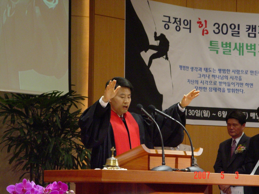 새로 임직한 장세광목사가 축도하는 사진]