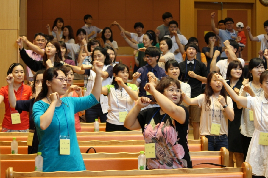 열심히 율동을 따라하는 교사들