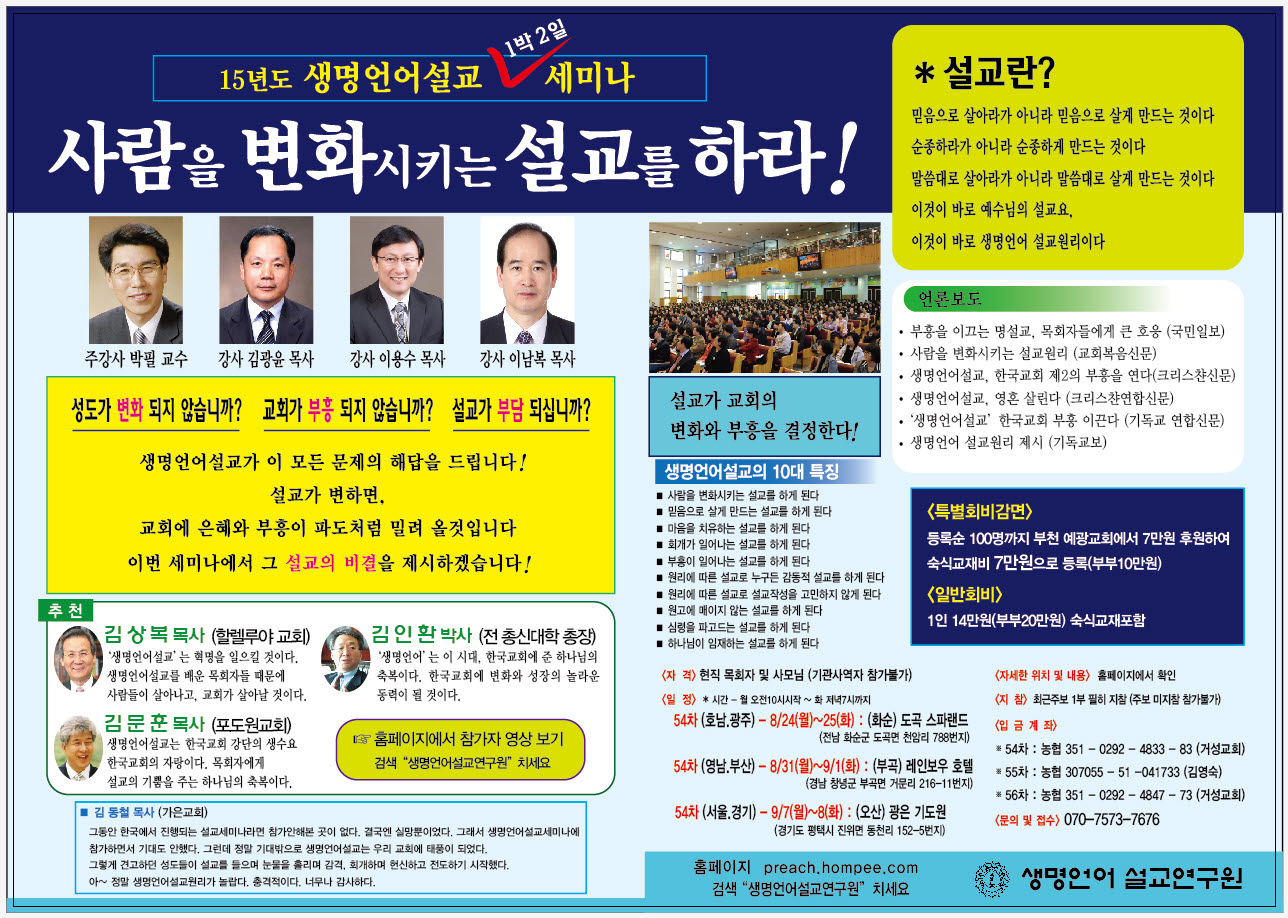 사람을 살리는 생명언어설교 세미나 관심있으신 분들 참여해 보시면 도움이 되실 것입니다.