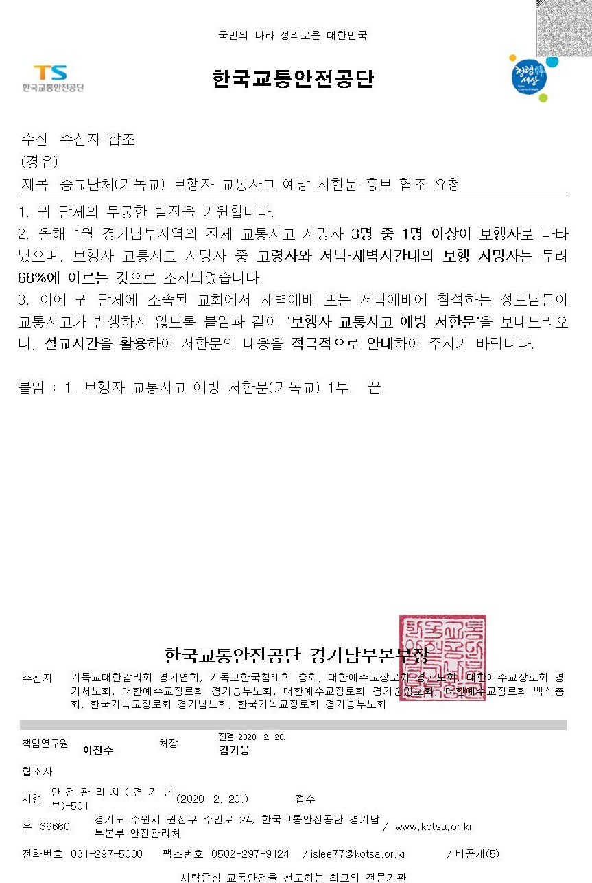 경기남부 각 교회에 교통안전을 위해 전달해 달라는 협조 요청이 왔습니다.