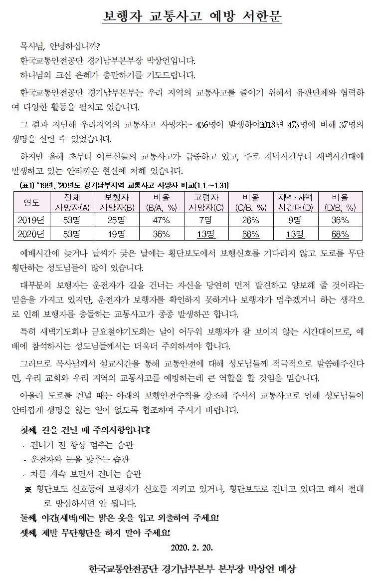 이에 우리본부에서 교통안전 서한문을 보내드리오니, 노회소속 교회에 전파하시어 목사님들께서 설교시간에 성도님들께 말씀해주셔서 사고가 발생하지 않도록 협조해 주시기 바랍니다. (경기남부 외 전 지역 교회에 알려주시면 더욱 감사합니다.)