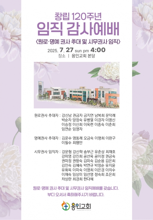용인교회 창립120주년 임직감사예배(원로.명예권사 추대 및 시무권사 임직)에 정중히 초대합니다.