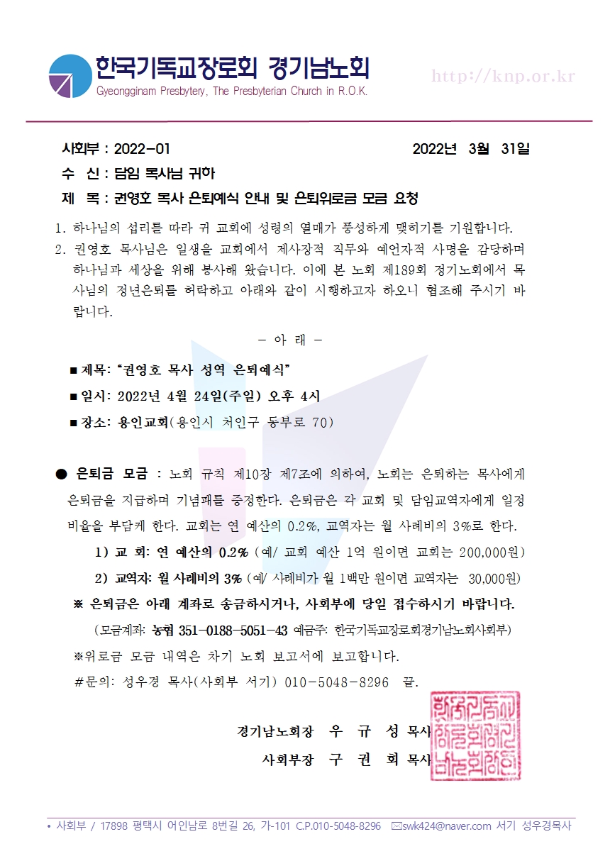 [사회부] 권영호 목사님 은퇴예식 안내 및 은퇴위로금 모금 요청