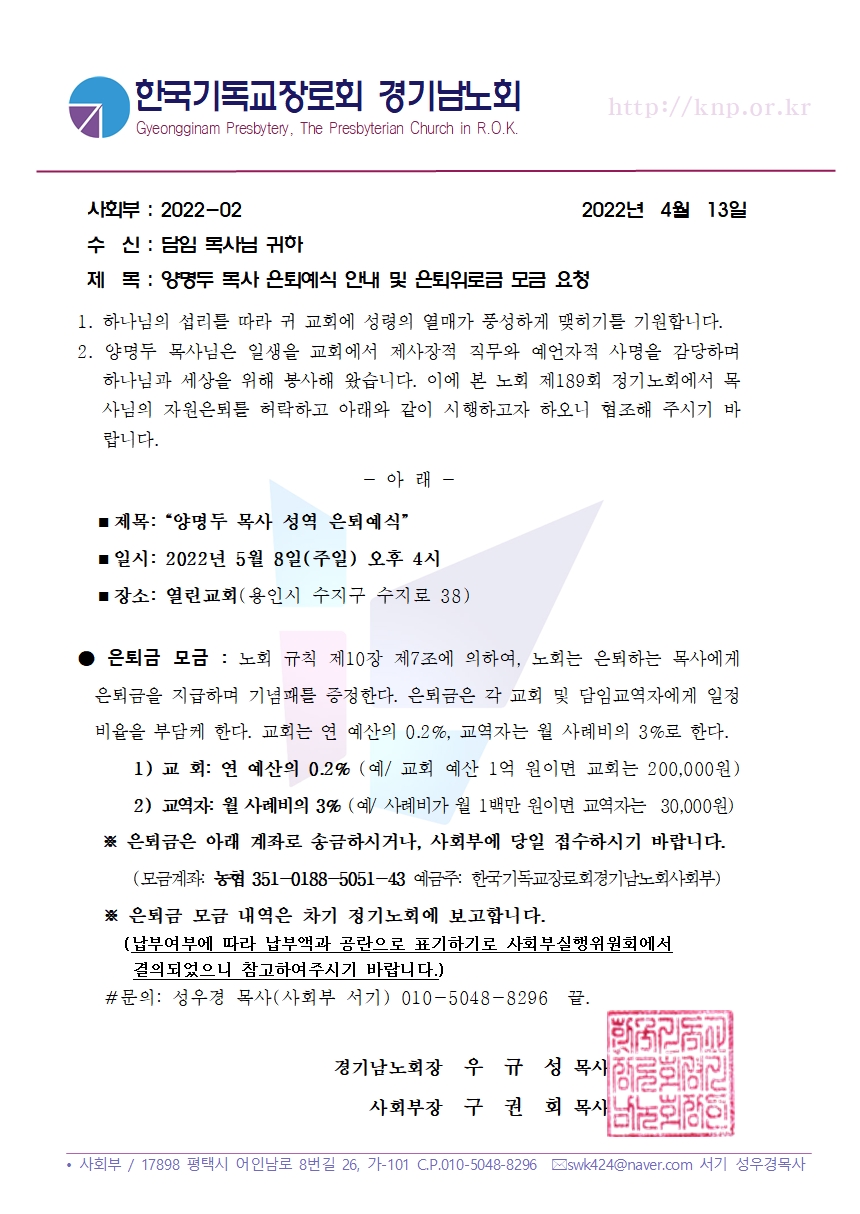 [사회부] 양명두 목사님 은퇴예식 안내 및 은퇴위로금 모금 요청