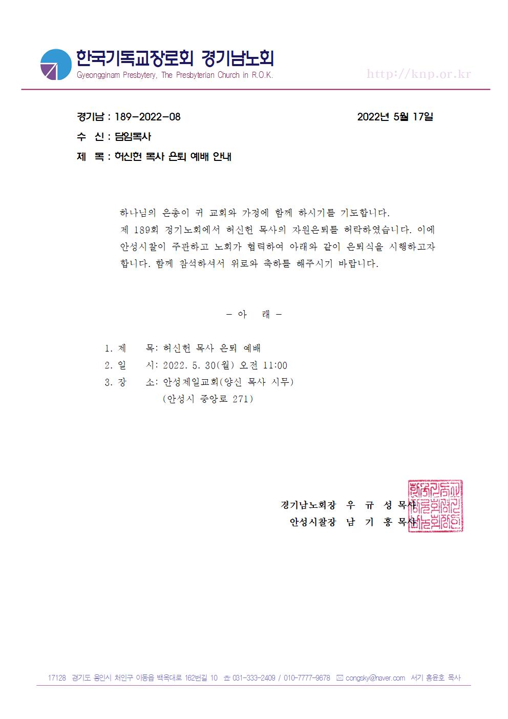 허신헌 목사 은퇴 예배가 5월 30일 11시에 안성제일교회에서 있습니다.