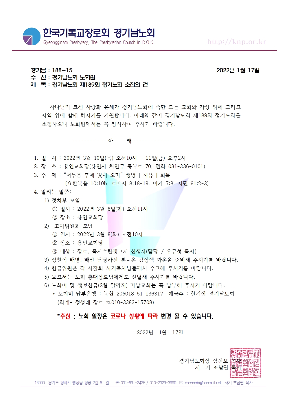 (예금주: 한기장경기남노회) 홈페이지관리: 김현일 목사