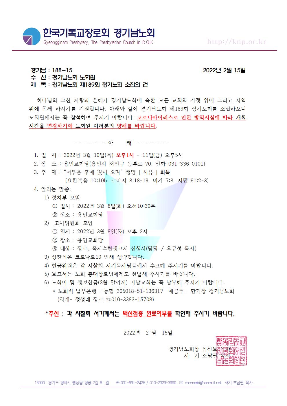 [노회서기부] 제 189회 정기노회 시간 변경에 대한 공지