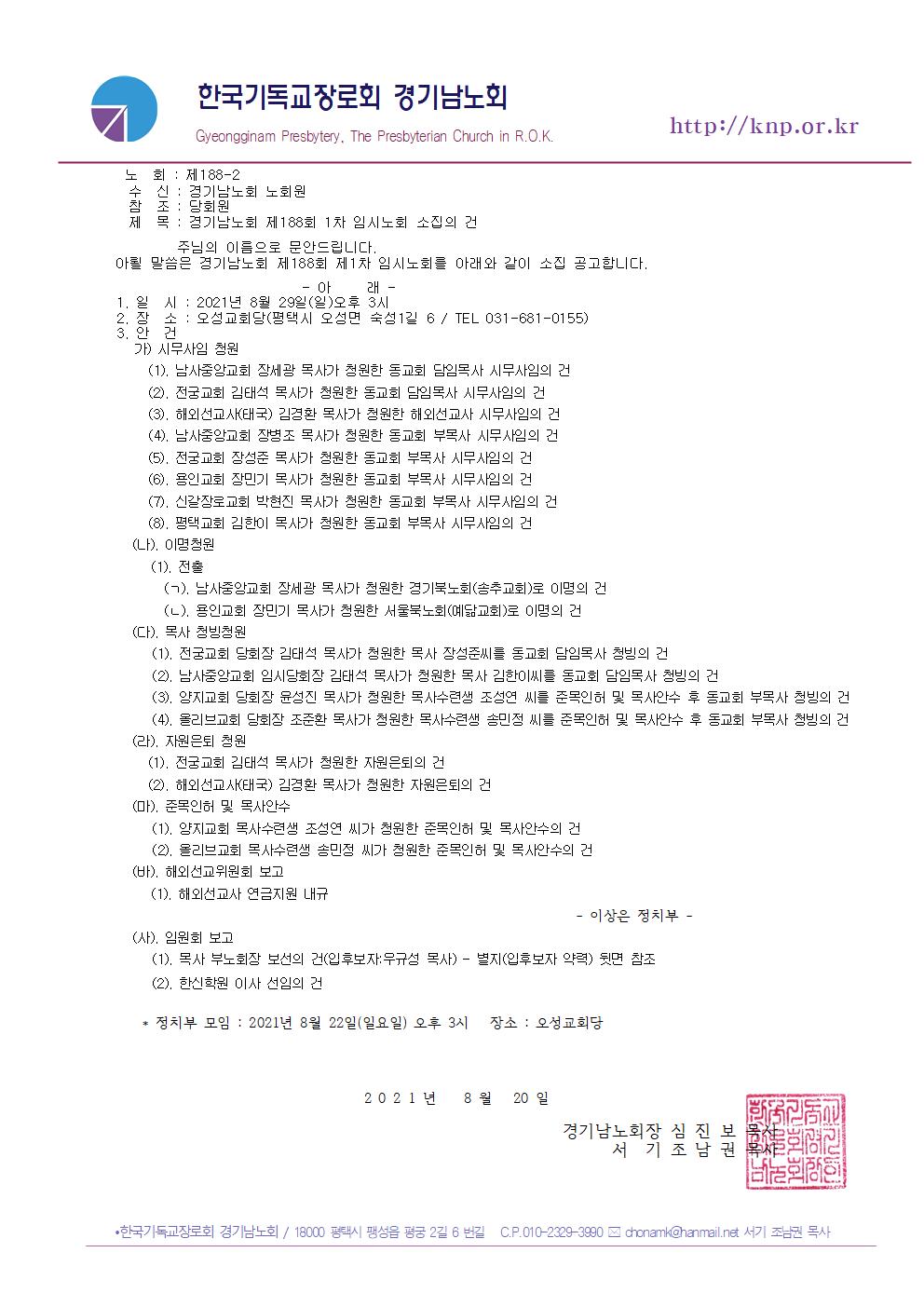 경기남노회 188회 1차 임시노회 (연기/8월29일/일요일/오후3시)