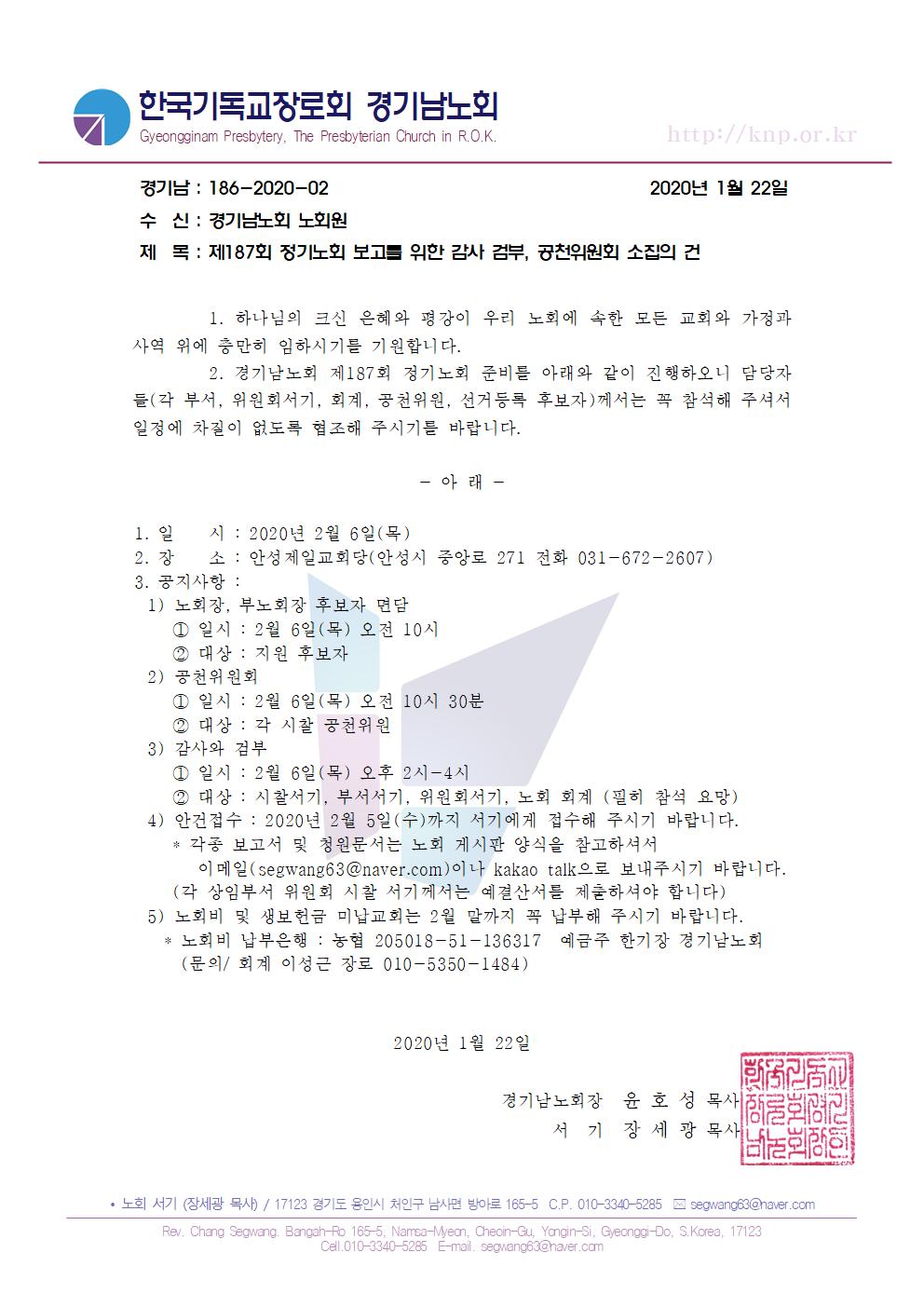 [노회서기부] 감사, 검부, (부)노회장입후보자 면담, 공천위 등 공지