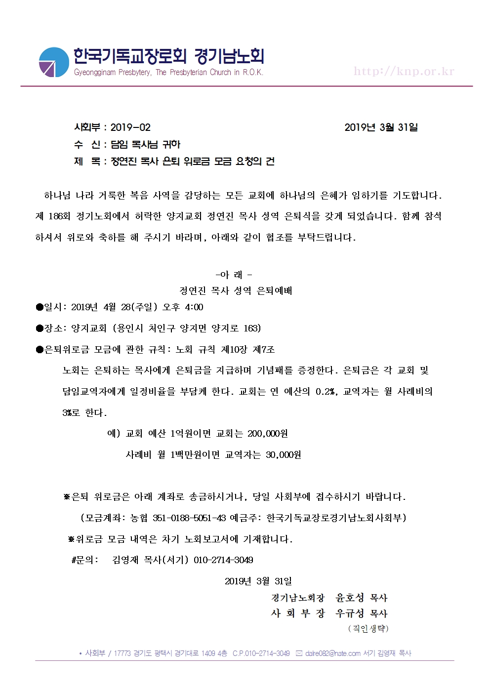 [사회부] 정연진 목사님 은퇴위로금 협조 요청 공문 올립니다.