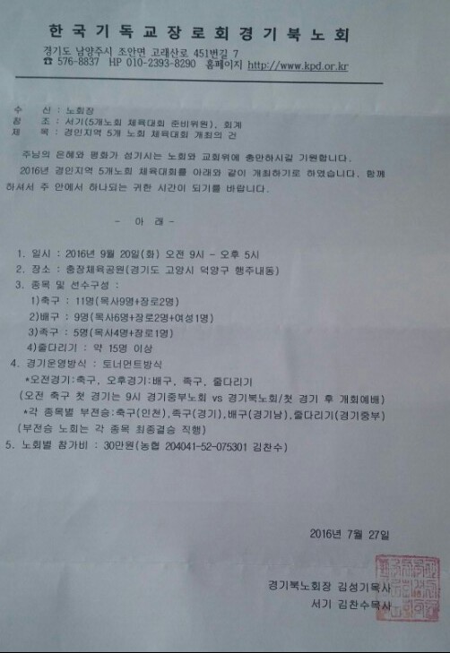 좀 이른듯 하지만 미리 미리 일정을 조정해 주십사, 5개노회 체육대회에 대해 공지합니다