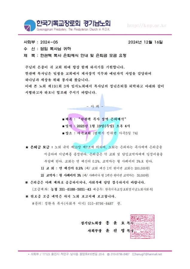 [사회부] 한관택 목사님 은퇴에식 및 은퇴금 모금 요청합니다!
