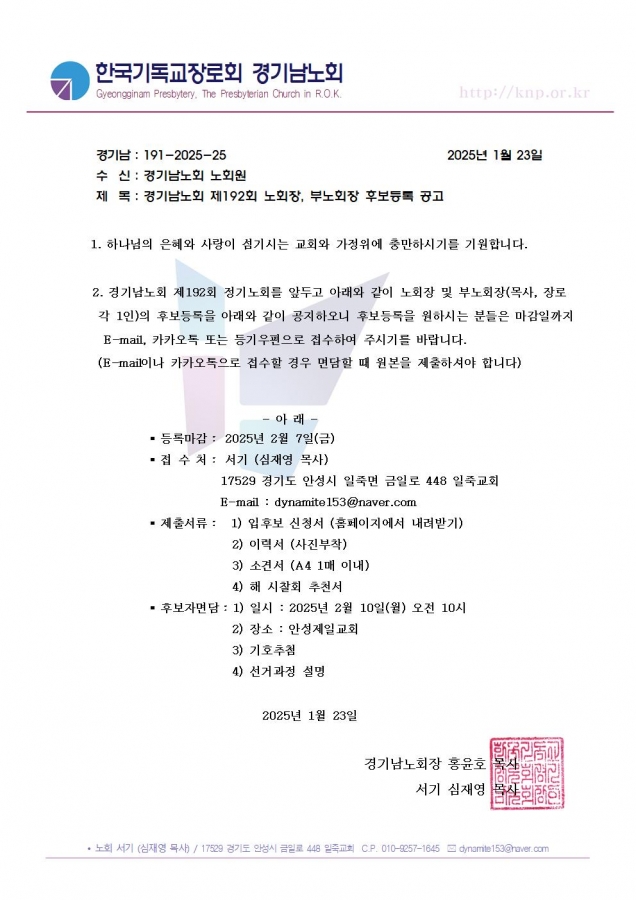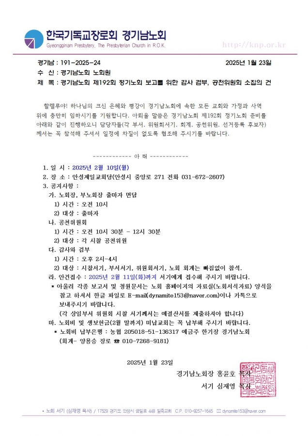 [노회서기부] 감사,검부,공천위원회, (부)노회장 후보 등록, 면담 공지