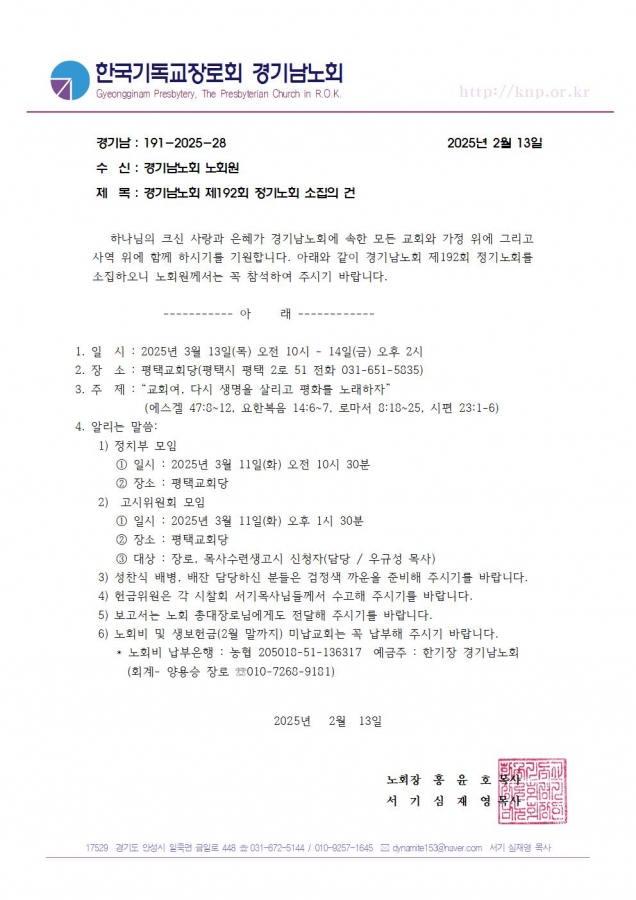 (예금주: 한기장경기남노회)    홈페이지관리: 김현일 목사