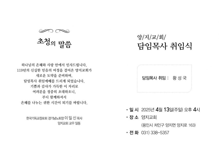 양지교회 황성국 담임목사 취임 감사예배에 정중히 초대합니다.