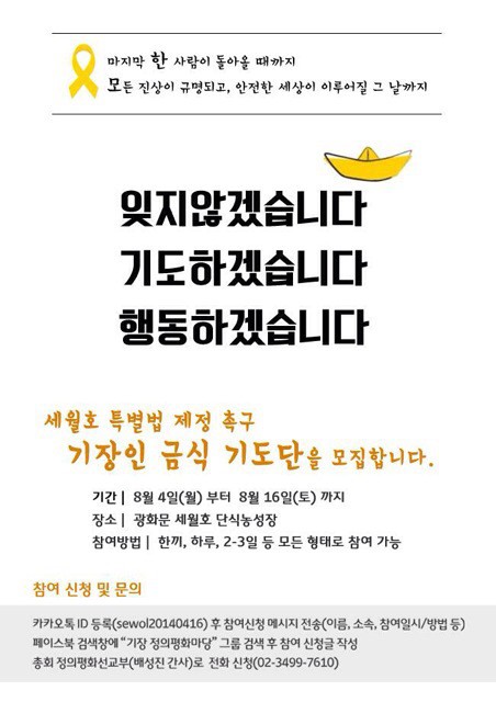 세월호 특별법 제정 촉구 기장인 금식기도단에 사회부가 동참하고자 합니다. 애통해하는 자들과 함께 하실 분들은 8월 12일(화) 오후 2시까지, 가곡교회로 오세요.