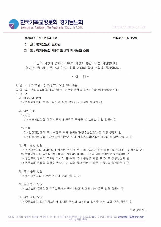 [노회서기부] 제191회 2차 임시노회 소집 공고입니다.
