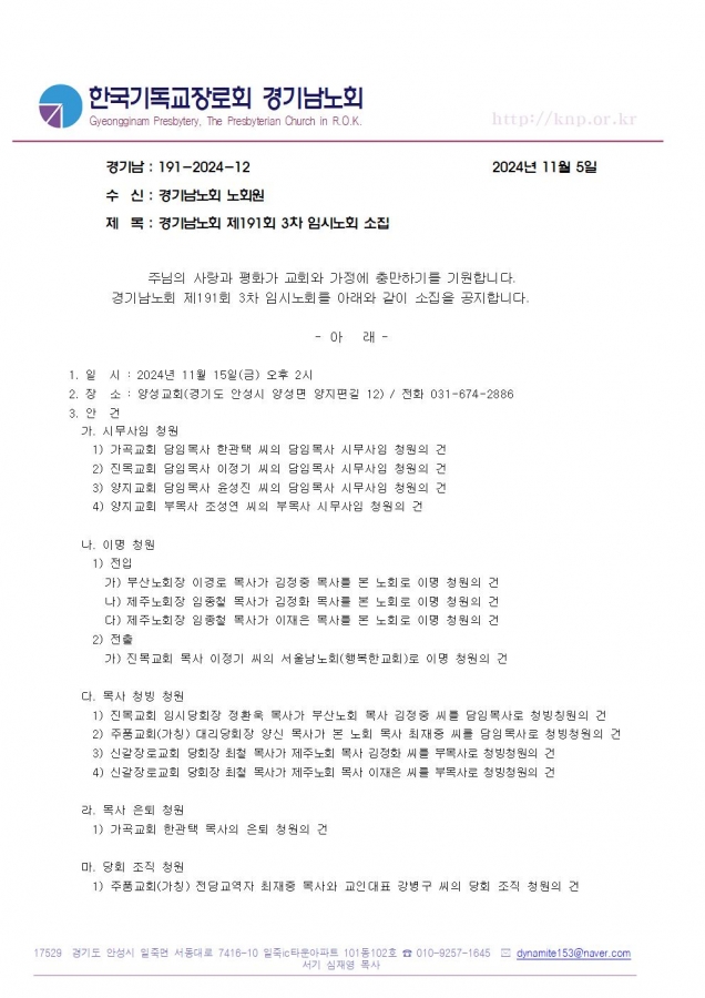 [노회서기부] 제191회 3차 임시노회 소집공고 입니다.