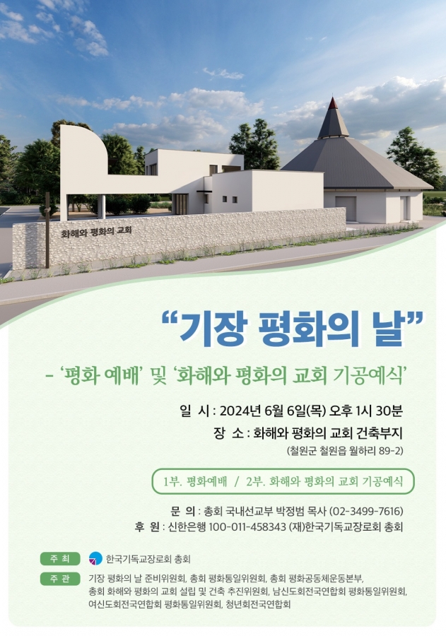 이제 지명경쟁입찰을 통해 시공사 선정 작업을 진행 중에 있으며, 6월 6일(목) 오후 1시 30분에 화해와 평화의 교회 건축부지에서 <기장 평화의 날 – ‘평화 예배’ 및 ‘화해와 평화의 교회 기공예식’>을 진행한다고 합니다.