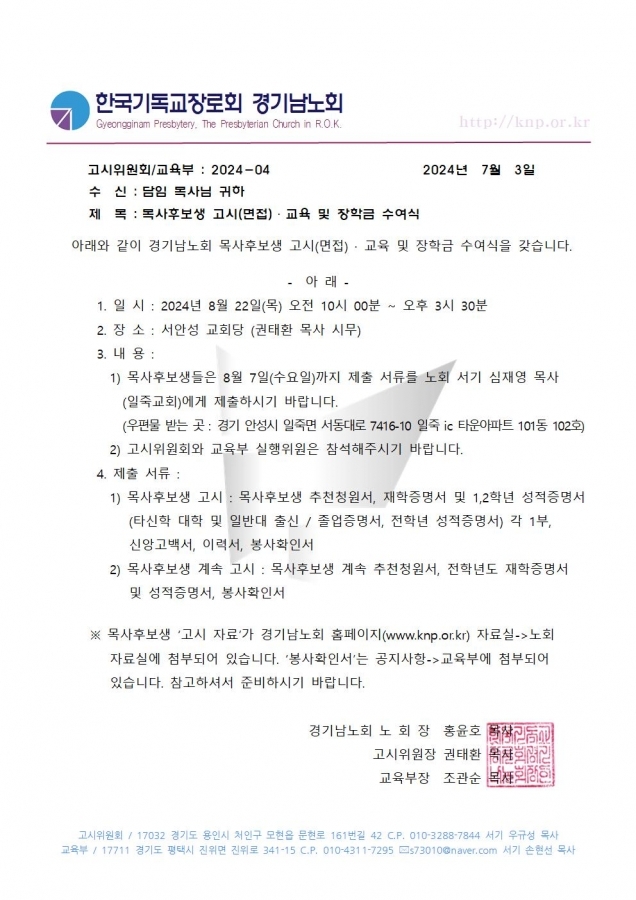 [교육부] 2024년 하반기 목사후보생 고시, 교육 및 장학금 수여식