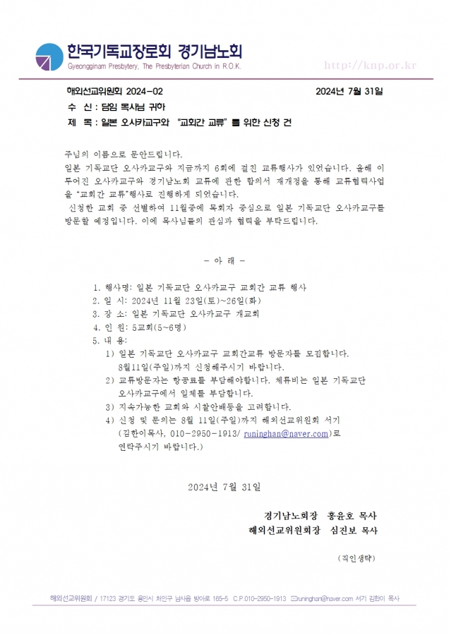 일본 기독교단 오사카교구와 교회간 교류 행사 안내입니다.