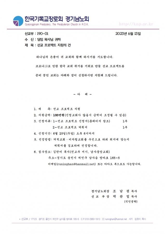 (예금주: 한기장경기남노회) 홈페이지관리: 김현일 목사