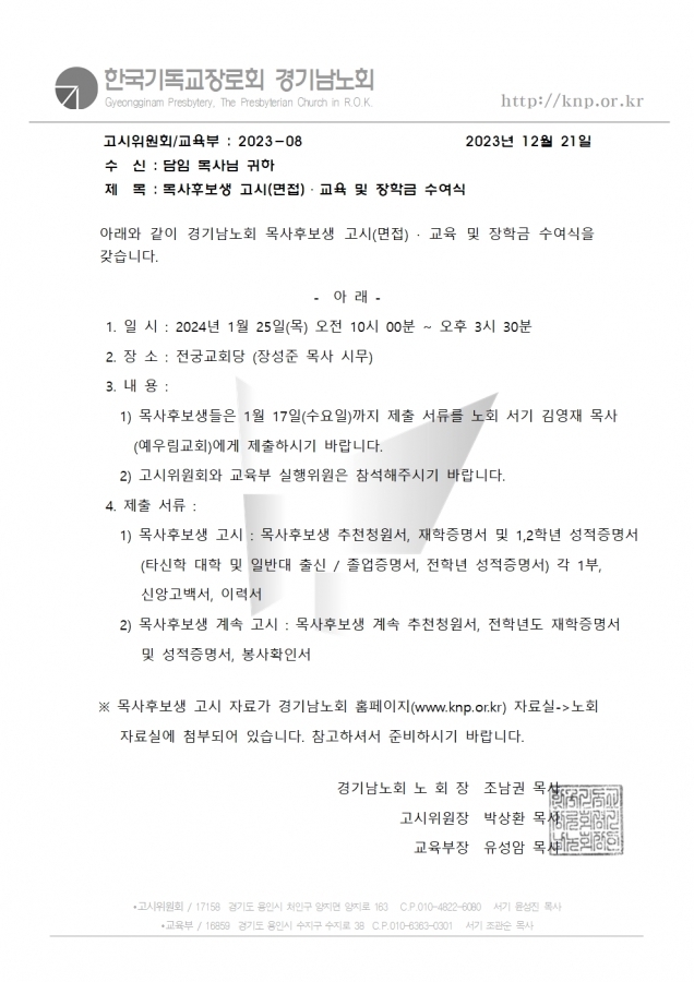 해당 교회에서는 참고하시어 기간 내에 필요 서류를 제출해 주시기 바랍니다.