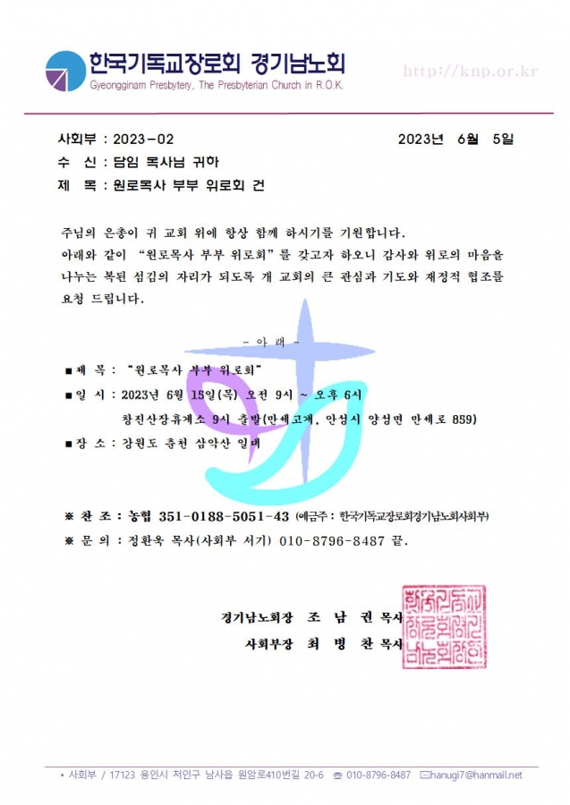 원로목사 위로회가 6월 15일 춘천으로 떠납니다.