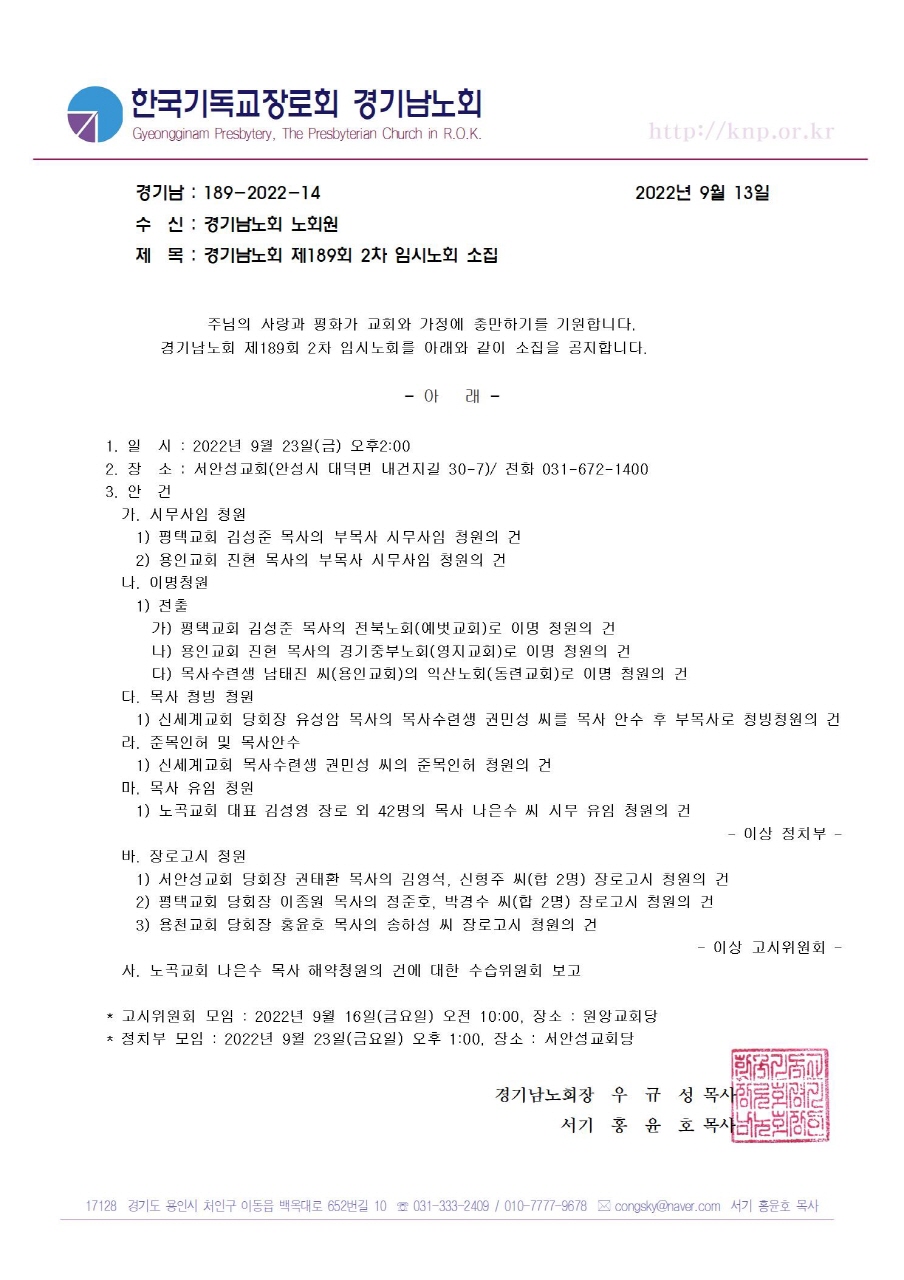 [노회서기부] 제189회 2차 임시노회 소집공고