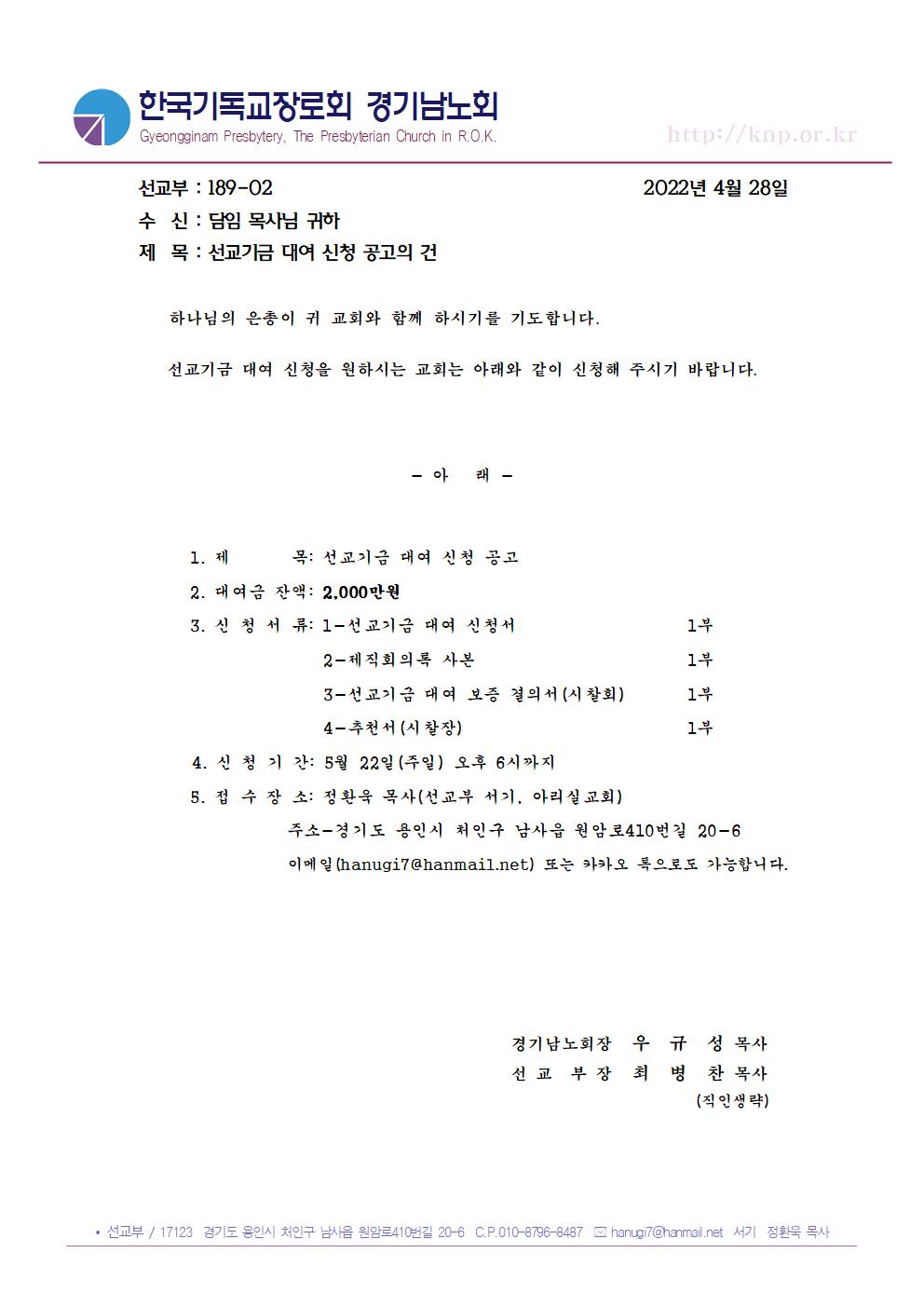 선교대여기금 청원서 및 보증결의서 첨부합니다.