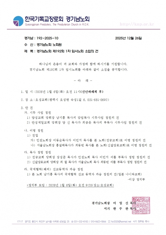 [노회서기부] 192회기 1차 임시노회 소집의 건
