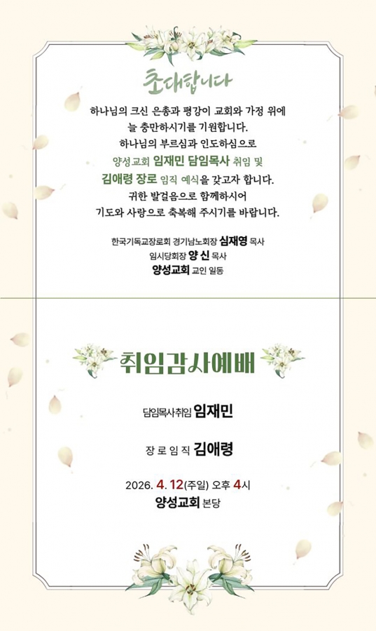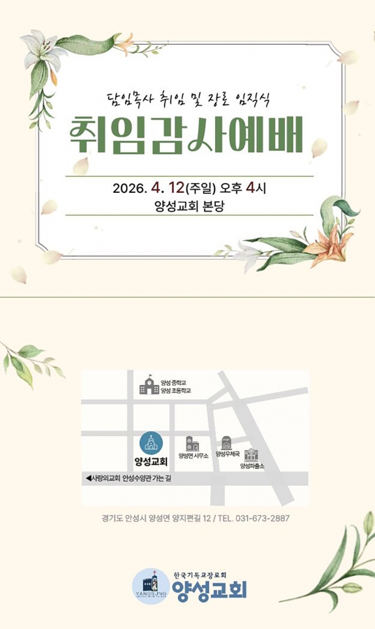 양성교회 담임목사 취임 및 장로임직 감사예배에 초대합니다